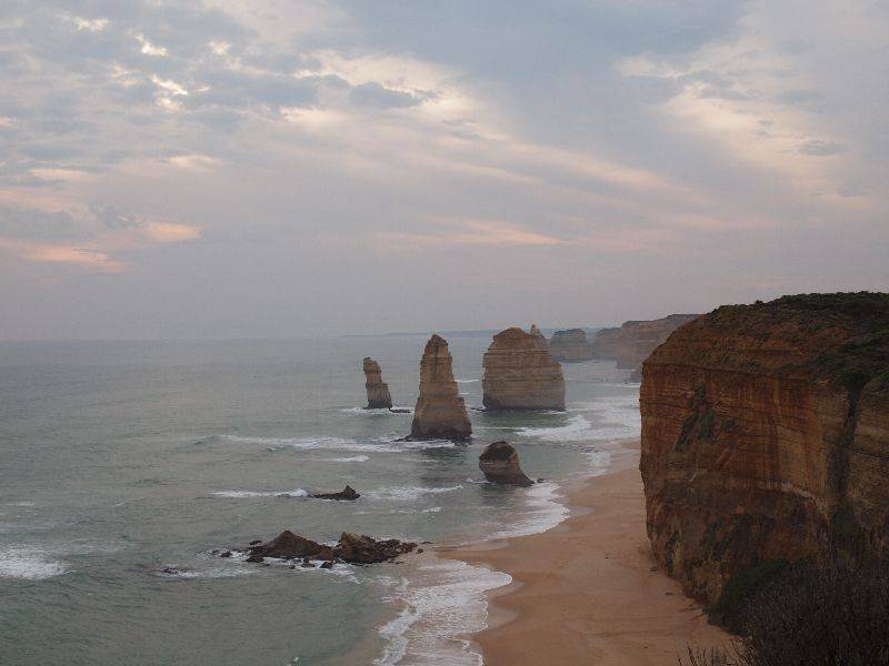 Von Melbourne aus starteten wir und fuhren Richtung Anglesea. Dort gelangten wir auf die berühmte Great Ocean Road. Eine ca. 250 Kilometer lange Küstenstrasse zwischen Torquay und Warrnambool. Die Strasse schlängelt sich der Küste entlang; mal tief unten den Ständen entlang, dann mal etwas höher oben mit weitem Ausblick über das Tasmanische Meer. Ganz im Süden fuhren wir durch den Cape Otway National Park und machten einen Abstecher ans Cape. Der National Park ist voll von Eukalyptusbäumen. Dort, wo es solche Bäume hat, muss es auch Koalas haben. So fuhren wir manchmal ganz langsam und blickten hoch in die Bäume. Aber das war gar nicht so einfach während dem Fahren. Doch zum Glück stand ein Camper am Strassenrand und ein paar Leute mit Fotoapparaten vor den Bäumen. Da wussten wir, es muss Koalas haben. Genau so war es. Nicht nur einer oder zwei. Wenn man genau durch die Baumwipfeln und Astgabeln schaute, entdeckte man da und dort so einen knuddeligen „Bären“. Die meisten waren jedoch damit beschäftigt nichts zu tun, sprich schlafen. Den Leuchtturm am Cape Otway liessen wir aus, denn $ 17.50 pro Person war doch fast unverschämt, nur um einen Leuchtturm von aussen anzuschauen. So fuhren wir weiter auf der wunderschönen Strasse entlang der Küste, bis wir zu dessen Höhepunkt gelangten, den zwölf Aposteln. Bis zu 60 Meter hohe Kalksteine, die im Meer stehen. Beeindruckend. Trotz ihres Namens bestand die Felsformation nur aus neun Felssäulen und nicht zwölf und 2005 stürzte eine in sich zusammen, so sind es nur noch acht. Ein wirklich spektakuläres Bild, diese Felsen in der Brandung.