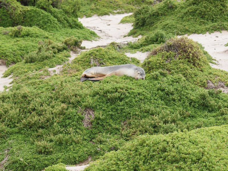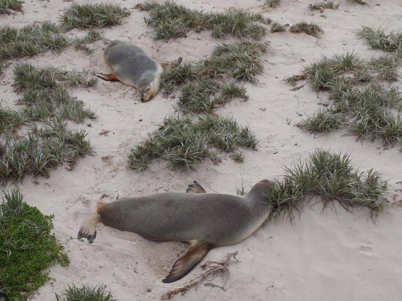 Da wo Känguru drauf steht, muss auch Känguru drin sein – oder so. Aber sicher! Doch das kam erst ganz zum Schluss. Wenn der Wecker morgens um fünf schon los geht, dann muss was ganz Besonderes auf dem Programm stehen. Pünktlich um sechs Uhr wurden wir vom Shuttle Bus abgeholt und fuhren nach Cape Jervis. Dort wechselten wir auf die Fähre und fuhren nach Penneshaw auf Kangaroo Island. Kangaroo Island ist die drittgrösste Insel Australiens (nach Tasmanien und Melville Island) mit einer Länge von 155 Kilometer und einer Breite von 56 Kilometer. Mit dem Tourbus machten wir uns auf eine Reise quer durch Kangaroo Island. Den ersten Halt machten wir an der Seal Bay. Wie der Name schon sagt, diese Bucht gehört ganz und alleine den Seelöwen. So hatten wir die Gelegenheit, die Tiere in ihrer natürlichen Umgebung aus nächster Nähe zu beobachten. Der eine oder andere Seelöwe machte es sich auf einem Grashügel gemütlich. Die meisten jedoch lagen am Stand und machten dolce far niente. Australische Seelöwen können bis 2.5 Meter lang und 300 Kilogramm schwer werden. Leise verliessen wir den Strand um die Meute nicht aufzuwecken und fuhren weiter über die Insel. Nach dem Lunch zeigte uns ein Ranger ein paar einheimische Raubvögel. Ein kleiner Falke, eine Schleiereule, zwei Kookaburra sowie ein Adler, ein Wedge-tailed-Eagle, bekannt als Eaglehawk, waren zu bestaunen. Der Adler gehört zu den grössten Greifvögeln mit einer Flügelspannweite von bis zu 2.5 Metern. Dann fuhren wir durch den Flinders Chase National Park zu den Remarkable Rocks. Das sind markante, zerbrochene Granitfelsen auf einem Steinplateau, die von Wind und Wasser gezeichnet sind. Die Felsbrocken haben ganz bizarre Formen und Strukturen und je nach Sonnenstand ändern sich die Farben. Von dem Wahrzeichen von Kangaroo Island ging es weiter zum Admirals Arch, ein Felsbogen am Ende einer Klippe. Beim hinunter laufen zur Klippe bemerkten wir gar nicht, dass wir über diesen Bogen gelaufen sind. Erst als wir seitlich der Klippe waren, konnten wir den gewaltigen Felsbogen aus Kalkstein mit den hinunter hängenden Stalaktiten sehen. Ebenfalls ein Ergebnis der Erosion der starken Brandung die über Jahrtausende hinweg am Felsen gearbeitet hatte. Rund um die Klippe tummelten sich Neuseeländische Pelzrobben. Auf dem einen Felsen hatte es eine Art Pool, gefüllt mit Meerwasser und Robben die herum plantschten. Es ist echt köstlich diesen Tieren zu zuschauen.