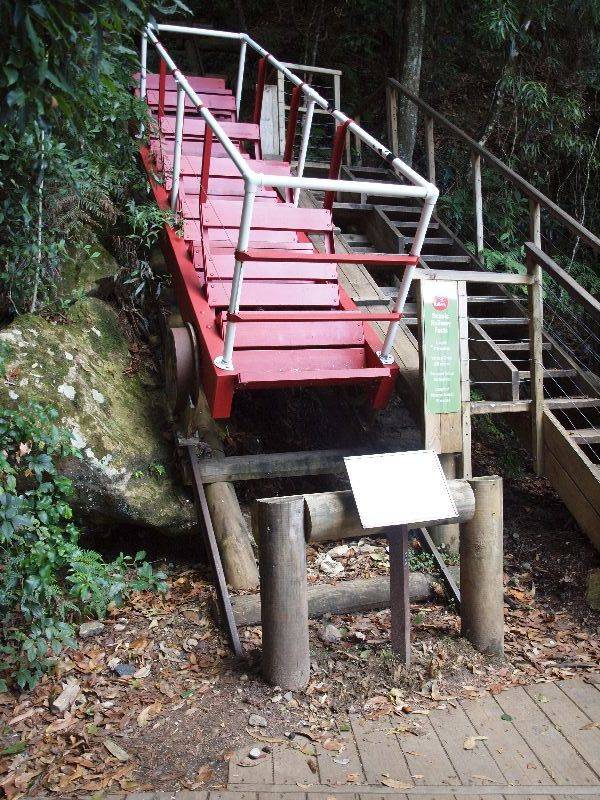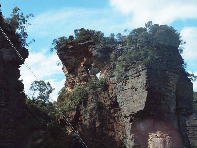 Unser erster Ausflug führte uns in die Blue Mountains, westlich von Sydney. Nach einer kleinen Wanderung durch Gebüsch, Ur- und Regenwald erreichten wir den Wasserfall Leura Cascades. Der kleine Bach fliesst über die Steine wie über eine Treppe. Der Weg endet plötzlich auf einer Plattform. Von dort aus schauten wir über hundert Meter in die Tiefe. Der mittlerweile grössere Bach stürzt über die Felsen tief in die Schlucht. Zurück bei unserem Camper fuhren wir weiter zum Echo Point mit bester Aussicht auf die The Three Sisters, die berühmteste Felsformation der Blue Mountains. Die drei Felsbrocken am Ende einer Gebirgskette entstanden durch Verwitterung und sind etwa 200 Millionen Jahre alt. Weiter fuhren wir der steil abfallenden Klippe entlang bis wir Scenic World erreichten. Von dort fuhren wir mit einer extrem steilen Bahn die Klippen (fast senkrecht) hinunter, vorbei am Orphan Rock, mitten in den Regenwald hinein. Auf dem Weg durch den Wald kamen wir an ehemaligen Kohleminen vorbei. Über 100 Kilometer lang sind die Stollen der Kohleminen in den Blue Mountains. Mit der Luftseilbahn (Doppelmayr, Thun [sind wir nicht gut?!]) fuhren wir wieder zurück auf das Plateau der Blue Mountains.