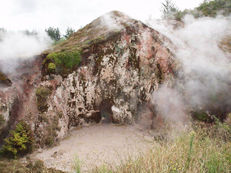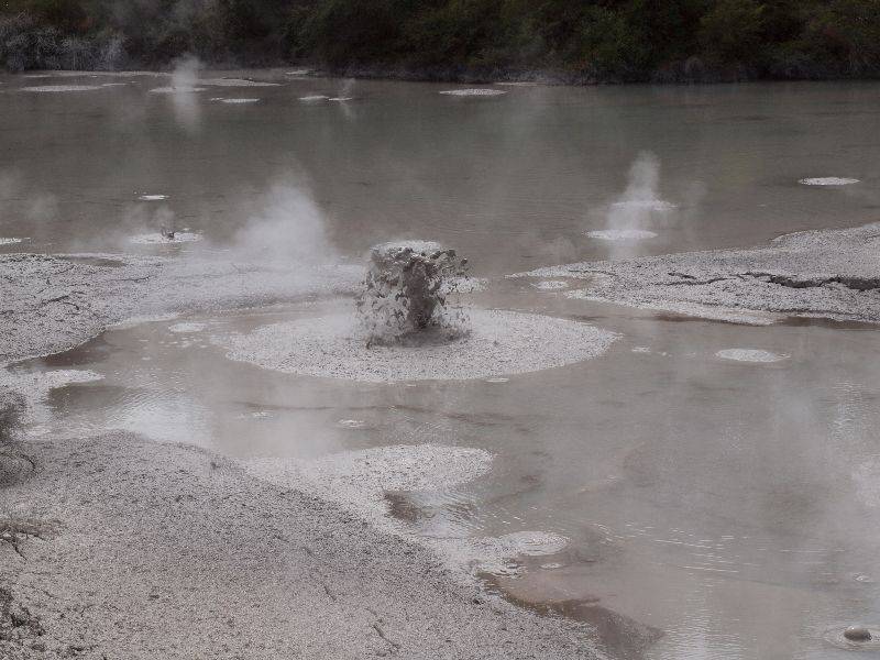 Wir setzten unsere Reise zu den Vulkanen trotzdem fort, aber mit einem unguten Gefühl. Denn Erdbeben und Vulkane gehören irgendwie in die selbe Familie und hinterlassen meistens einen grossen Schaden. Die drei Vulkane Mount Ruapehu, Mount Ngauruhoe und Mount Tongariro stehen im Tongariro Nationalpark. Der Mount Ruapehu, mit einer Höhe von 2‘797 Meter, ist der höchste Vulkan Neuseelands, ebenfalls höchster Punkt der Nordinsel und hatte die letzte Eruption am 25. September 2007. Von den sieben kleinen Gletschern die den Krater umgeben war natürlich keiner zu sehen. Die Wolkendecke verhüllte den Gipfel zu stark. Auch der Mount Tongariro war von grauen und weissen Wolken umhüllt. Nur der Mount Ngauruhoe war zu 2/3 sichtbar. Der Mount Ngauruhoe wurde in Herr der Ringe als Double für den Schicksalsberg genutzt, was ihn weltberühmt machte. Der Schicksalsberg im Nordwesten von Mordor war das Ziel der Reise von Frodo und Sam, um den Ring dort in die Schicksalsklüfte zu werfen und ihn damit zu zerstören. Unsere Reise war nicht ganz vergebens. Aber es wär doch schön gewesen die drei Vulkane komplett zu sehen. So begnügten wir uns mit Bestaunen eines Modells und den wunderschönen Ansichtskarten. Zurück entlang dem Lake Taupo fuhren wir ins Gebiet von Craters of the Moon, eine Landschaft mit dampfender Erde und schwefligem Geruch (so kann man sich vielleicht die Hölle vorstellen). Unweit davon steht das Geothermale Kraftwerk von Wairakei, wo der heisse Dampf aus der Erde in elektrische Energie umgewandelt wird. Das Kraftwerk produziert 181 MW Leistung und deckt ca. 3% des Energiebedarfs von Neuseeland. In Richtung Rotorua unterwegs fuhren wir an einem heissen Bach mit angrenzendem Campingplatz vorbei. Doch wir bevorzugten eine andere Bleibe. Denn der Bach ist nicht nur heiss, er riecht auch nicht gerade speziell gut (wo sind denn da die faulen Eier?).