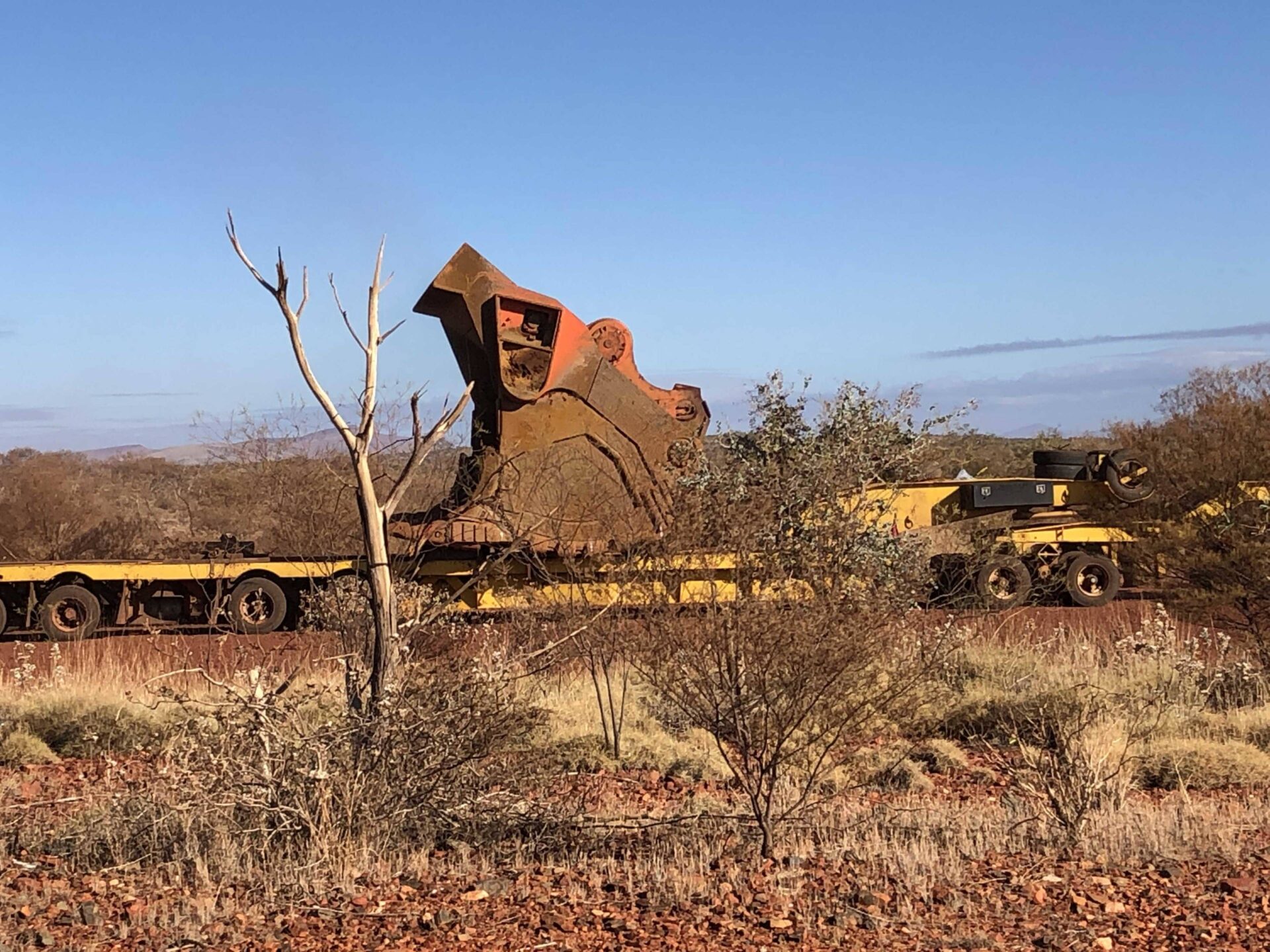 Heute wird eine Baggerschaufel ausgeliefert. Das war wohl die Mission des heutigen Tages für die Jungs des Transportunternehmens. Ein paar Kilometer östlich von Tom Price stiessen wir auf dieses Trüppchen. Bei uns zu Hause wäre das keine grosse Sache, doch hier ist die Baggerschaufel so breit wie zwei Fahrbahnen. Das heisst, wir schliessen uns dem Konvoi an und tuckerln hinterher. Bei der Durchquerung des Karijini Nationalparks gibt es eine Steigung von ca. 200 Höhenmeter. Kurz vor diesem Anstieg stellten der Truck und die Begleitfahrzeuge aus und wir konnten passieren. Wir gehen davon aus, dass sie noch ein bis zwei Trucks vorne anhängen werden, bevor der Hügel in Angriff genommen wird. Wir setzten unsere Fahrt zügig fort und erreichten bald den Great Northern Highway 95, die Verbindung zwischen Newman und Port Hedland. Newman, eine 1960 auf Grund der massiven Eisenerz Vorkommnisse gegründete Stadt. Der Hafen von Port Hedland ist der weltweit grösste Exporthafen für Schüttgut. Im Geschäftsjahr 2014/2015 hatten knapp 3‘000 Schiffe den Hafen angelaufen. Die grössten Schiffe, die abgefertigt werden, sind bis 330 Meter lang und mit einer Tragfähigkeit von 250‘000 Tonnen. Auf Grund dieser Eckdaten verkehren auf dem 95er Road Trains en mass. Wir hatten noch nie so viele Trucks gesehen. Die meisten mit 4, gewisse mit 5 Anhängern, maximal 53,5 Meter lang und bis 136 Tonnen Gesamtgewicht. Ein solches Fahrzeug hat 21 Achsen, welche je 4-fach bereift sind sowie eine Lenkachse. Das wären dann 86 Reifen. Viel Spass beim Wechseln bzw. beim Zahlen der Rechnung. Hauptsächlich wird Eisenerz transportiert, aber auch Brennstoff, Material für den Bergbau, Lebensmittel usw.