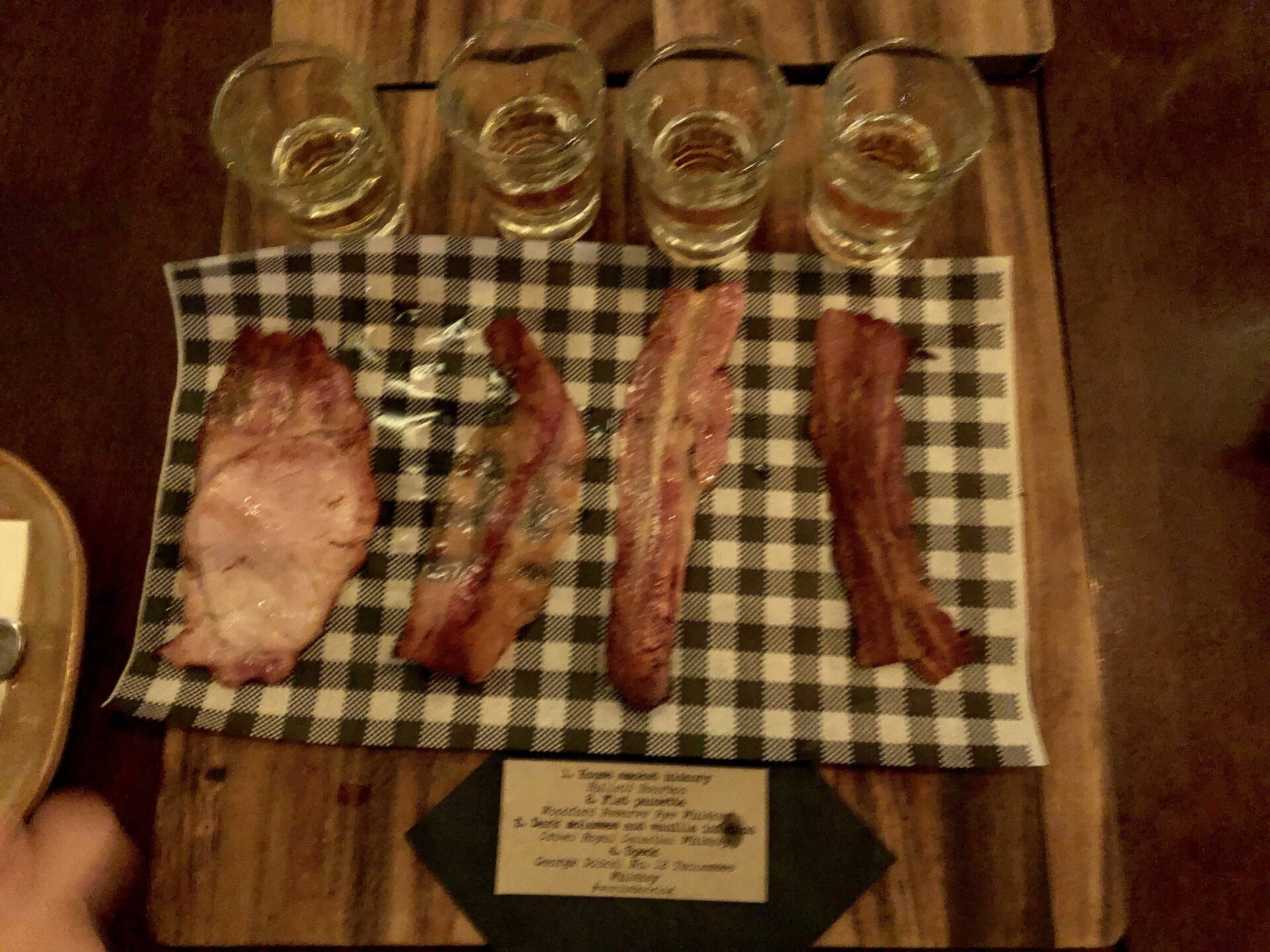 Der lange und ereignisreiche Tag war noch nicht zu Ende. Wir hatten uns mit Adele und Alan zum Nachtessen verabredet. Die Spezialität des Hauses: Whiskey and Bacon. 4 Whisky Shots mit je einer Scheibe gebratenem Speck, jeweils passend zum entsprechenden Whiskey. Eine richtig coole Idee, zum Glück nur als Apéro und in kleinen Mengen. Die Zeit verging wie im Fluge und wir genossen ein leckeres Nachtessen mit Freunden.