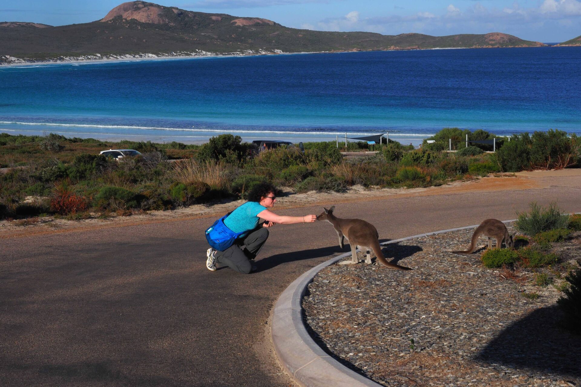 Der Tag gab uns noch etwas Zeit, so dass wir noch ein weiteres Phänomen in der Gegend auskundschaften wollten. Wir steuerten die rund 60 km entfernte Lucky Bay an. Der Name stammt übrigens von Matthew Filders (englischer Kartographe), der im Jahre 1802 während eines wütenden Sommersturms in der Bucht rettenden Schutz fand. Die Lucky Bay wird bei den Australiern als die Bucht mit dem weissesten Sandstrand angepriesen. Dasselbige gilt auch für den Whiteheaven Beach auf Whitsunday Island, welchen wir schon vor 8 Jahren besucht hatten. Uns kann es ja sch…egal sein, welches nun der weisseste Sandstrand ist. Denn schön sind sie so oder so, weiss sind sie auf jeden Fall und wir sind aus einem komplett anderen Grund hierhergefahren. Mit etwas Glück sieht man hier am Stand Kängurus, die diesen schönen Ort ebenfalls für sich entdeckt haben. Beim Heranfahren zum Parkplatz haben wir zwei kleine Kängurus angetroffen, die recht zutraulich waren. Isabella konnte quasi ein «high five» mit einem dieser beiden machen. Am Strand selbst sahen wir dann leider keine dieser Hoppelviecher, doch die anderen beiden waren immer noch in der Nähe des Parkplatzes. Bevor die Sonne unterging, erreichten wir unseren Zeltplatz in Esperance. Wir hatten wieder einen ganz tollen Tag in einer traumhaften Gegend erlebt.